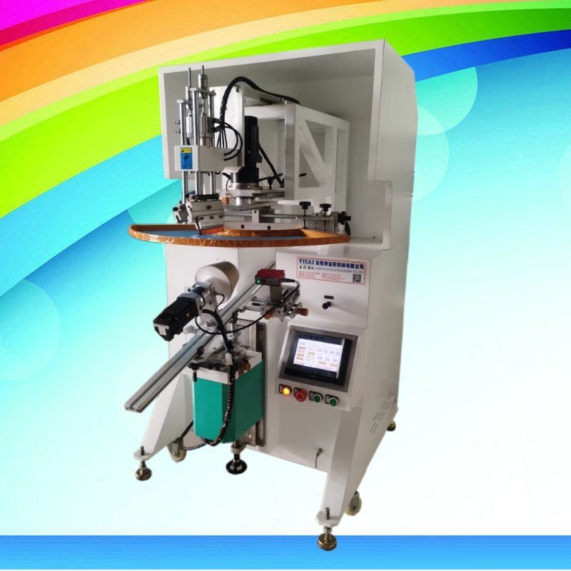 Designed for fine printing with taper products, Ordinary circular screen printer printing arc pattern will elongate and deform the pattern, Or product seragged, The printed pattern is large and small, The YICAI120C adopts the imitation printing mode, Syntaneous printing according to product arc, Can can avoid the deformation of the pattern, Improve the product printing quality; Relative to normal taper wire printing, Only for a single product, The YICAI120C is controlled by a dual servo motor, A servo motor controls the product rotation angle and speed, A servo motor controls net rotation speed and angle, The two servo motors proceed synchronously, Greater applicability, More versatility;